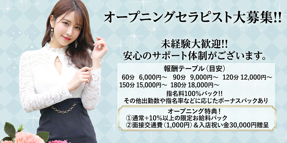 | 給与 | 60分 6,000円~8,000円 90分 9,000円~11,000円 120分 12,000円~14,000円 150分 15,000円~17,000円 180分 18,000円~20,000円 指名料 100%バック その他 OP100%バック、出勤数や指名率などに応じたボーナスバックあり、6時間以上勤務で最低保証あり |
