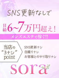浜松sora(ソラ)名古屋店のセラピスト求人情報はパンダエステジョブで! その他にも多数の愛知県・岐阜県・三重県・静岡県のメンズエステ店のセラピスト求人情報を毎日更新。 エステ未経験者でも安心の研修制度があったり、勤務時間も自由に組めたりするので、ストレスなく安全に高収入をゲット! 愛知県・岐阜県・三重県・静岡県のメンズエステの求人は名古屋パンダエステジョブにおまかせ!
