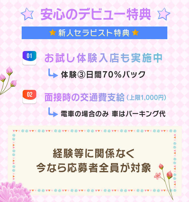 | 最高お給料獲得シミュレーション | ▼過去最高額のSさんの場合▼ 11時〜24時出勤(13時間勤務) 60分コース✖️1 90分コース✖️4 120分コース✖️2 150分コース✖️1 指名バック✖️2 オプション✖️3 合計85,000円‼️ ▼当店入店1ケ月のMさんの場合▼ 12時〜22時出勤(10時間勤務) 60分コース✖️1 90分コース✖️2 120分コース✖️2 150分コース✖️1 オプション✖️2 合計54,000円‼️ ▼早番のみのYさんの場合▼ 11時〜17時出勤(6時間勤務) 90分コース✖️1 120分コース✖️1 150分コース✖️1 指名バック✖️1 合計35,000円‼️ 当店の給料シュミュレーションは、平均給料の一例です! 注:他店によくある最高額ではありません! それでも不安な方には待機保証もご用意♪ 【待機保証も充実!!】 ⭐️時間保証:時給1,000円以上⭐️ ⭐️日給保証:日給20,000〜以上⭐️ ‼️日給5万円以上可‼️ |