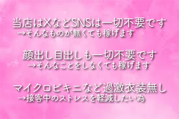 | 給与 | 出勤時間によりますが、日給”3万円~9万円”が目安です。 もちろん長時間の出勤で、10万円以上可能です。 ☆実力に応じて、コース料金の最大約80%以上バック可能(基本は60%) ☆オプションバック率100%(最大5000円) ☆指名料バック率100% |