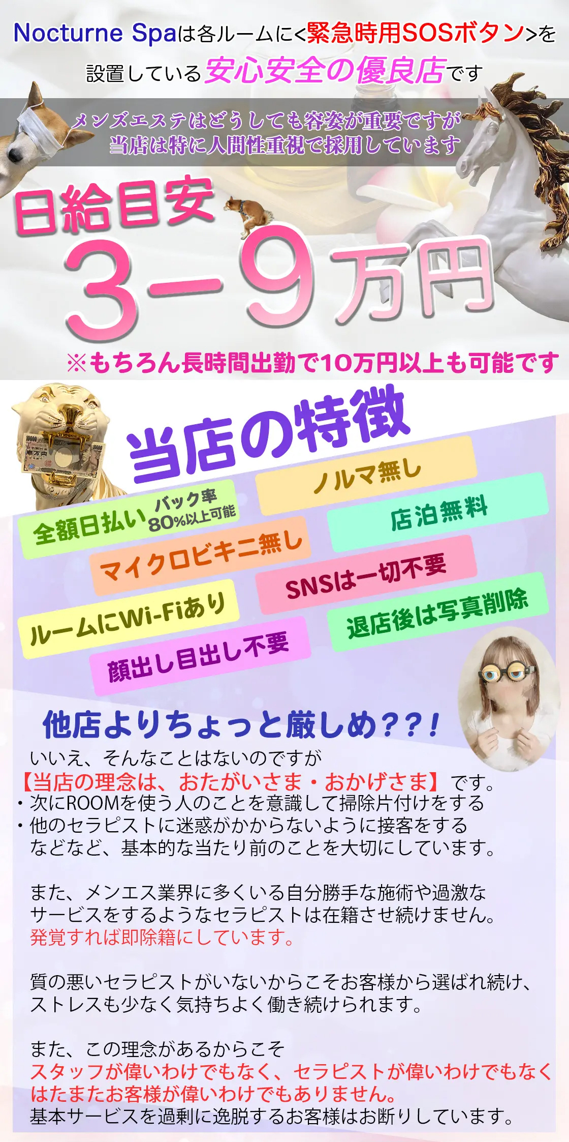 NocturneSpa(ノクターンスパ)のセラピスト求人情報はパンダエステジョブで! その他にも多数の東京都・千葉県・埼玉県のメンズエステ店のセラピスト求人情報を毎日更新。 エステ未経験者でも安心の研修制度があったり、勤務時間も自由に組めたりするので、ストレスなく安全に高収入をゲット! 東京都・千葉県・埼玉県のメンズエステの求人は東京パンダエステジョブにおまかせ!