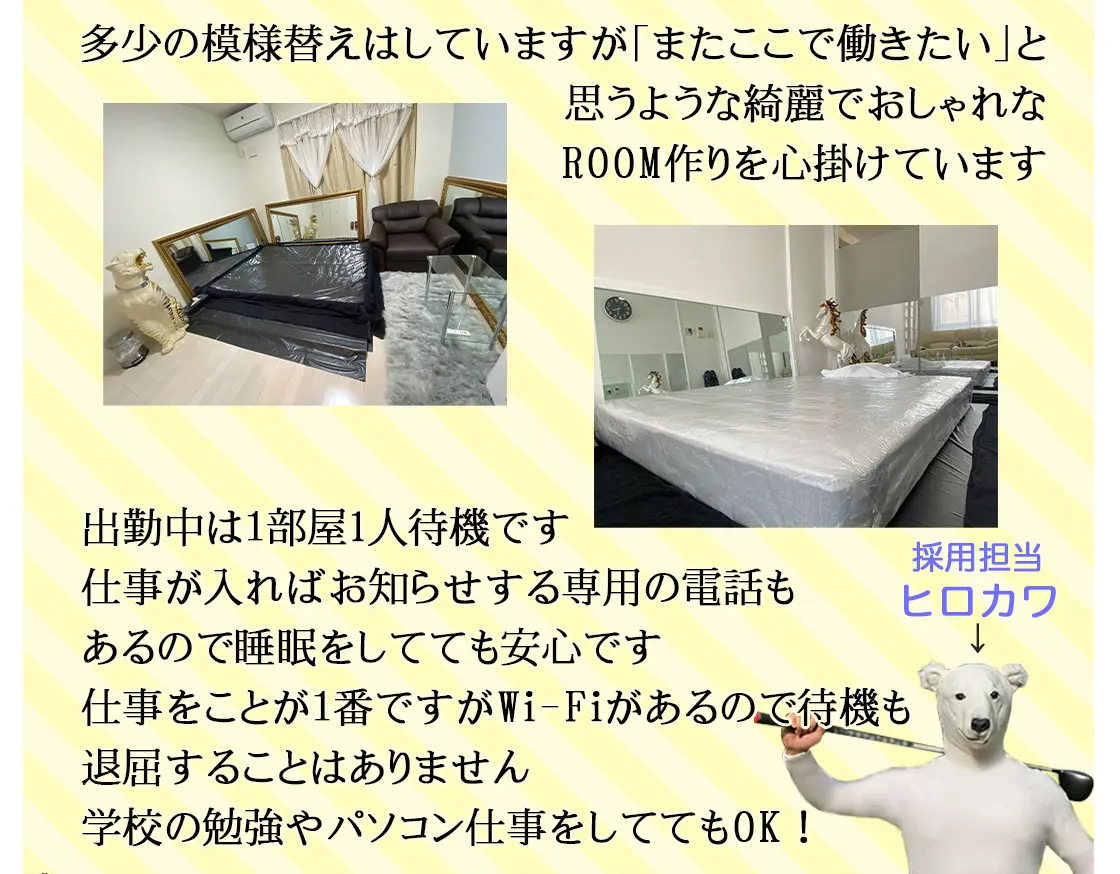 雇用条件等は雇用契約をする前にしっかりとご確認下さい。 (入店祝い金や日給最大◯◯円など) 雇用者間とのトラブルに関して当サイトは一切の責任を負いません。 また表示されている情報と面接に行った際の内容が違うものだったり、 違法行為を促されたりした場合はこちらよりお知らせ願います。